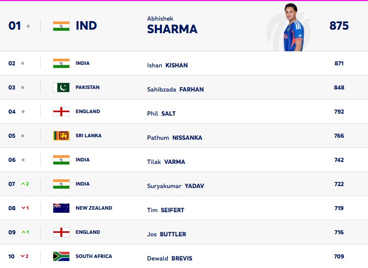 ପୁଣିଥରେ ଆଇସିସି ପକ୍ଷରୁ ପ୍ରକାଶ ପାଇଲା ସଦ୍ୟତମ ଟି-୨୦ ରାଙ୍କିଙ୍ଗ । ପ୍ରକାଶ ପାଇଥିବା ଏହି ରାଙ୍କିରେ ନ୍ୟୁଜିଲାଣ୍ଡ ଏବଂ ଦକ୍ଷିଣଆଫ୍ରିକା ଖେଳାଳିମାନେ କମାଲ କରିଥିବା ବେଳେ ଟପ୍-୧୦ ଭିତରେ ୪ ଜଣ ଭାରତୀୟ ଖେଳାଳି ରହିଛନ୍ତି । ଏକ ଉଲ୍ଲେଖନୀୟ କଥା ହେଉଛି ଯେ ଭାରତୀୟ ଦଳର ଅଧିନାୟକ ସୂର୍ଯ୍ୟକୁମାର ଯାଦବ ସମ୍ପ୍ରତି କୌଣସି ମ୍ୟାଚ୍ ଖେଳି ନଥିବା ସତ୍ତ୍ୱେ ଲାଭବାନ ହୋଇଛନ୍ତି । ରାଙ୍କିଙ୍ଗ ତାଲିକାରେ ତାଙ୍କ ନାମ ଉପରେ ରହିଛି । ସୂର୍ଯ୍ୟକୁମାର ଯାଦବ ଏକ ଲମ୍ବା ଲମ୍ଫ ମାରିଥିବା ବେଳେ ସେ ଟପ୍-୧୦ ମଧ୍ୟରେ ପ୍ରବେଶ କରିଛନ୍ତି । ସୂର୍ଯ୍ୟକୁମାର ଯାଦବ ସପ୍ତମ ସ୍ଥାନରେ ରହିଛନ୍ତି । ସେହିପରି ଏହି ରାଙ୍କିଂରେ ଏକ ନମ୍ବର ସ୍ଥାନରେ ରହିଛନ୍ତି ଭାରତୀୟ ଓପନର ଅଭିଶେକ ଶର୍ମା । ଦ୍ବିତୀୟ ସ୍ଥାନରେ ଇଶାନ କିଷନ ନିଜର ସ୍ଥାନ ବଜାୟ ରଖିଥିବା ବେଳେ ତିଲକ ବର୍ମା ଷଷ୍ଠ ସ୍ଥାନରେ ରହିଛନ୍ତି ।